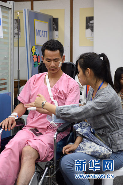 7月9日,在泰国普吉岛的哇集拉医院,一名华人志愿者(右)指导中国受伤游客活动手指关节。新华社记者 秦晴 摄。