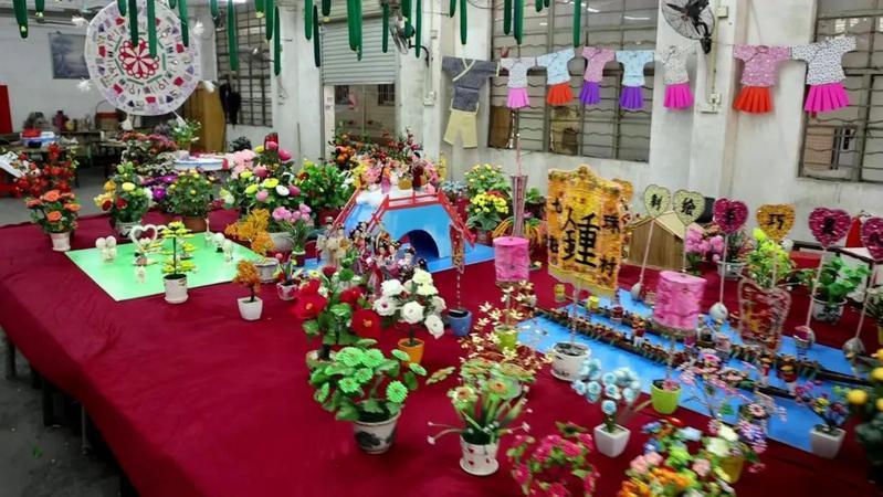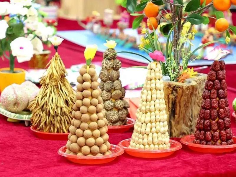 走进祠堂,各种精美巧品陈列在明德堂贡台上,栩栩如生的瓜果,真假难辨的花卉,精心雕琢的古建筑、鹊桥相会等永恒的七夕元素……争奇斗艳,琳琅满目。