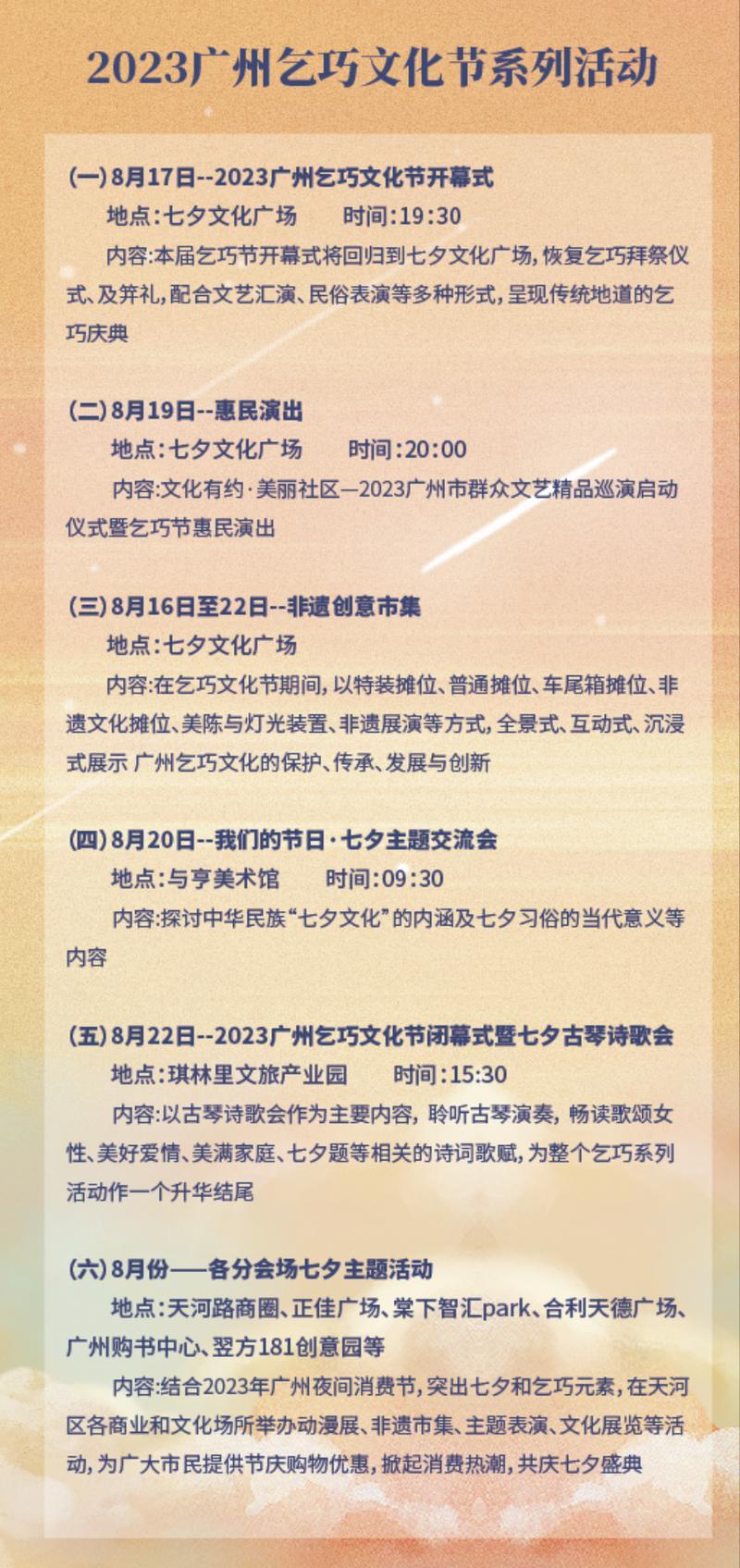 今年的广州乞巧文化节将突出“七夕之美”,分“7”天“7”场的主题系列活动,推动国家级非物质文化遗产瑰宝——“七夕节(天河乞巧习俗)”出新出彩,以珠村传统乞巧活动为“点”,以各大商圈配套活动为“线”,在七夕文化广场连续七天举行不间断的文化活动广州抓龙筋理疗。