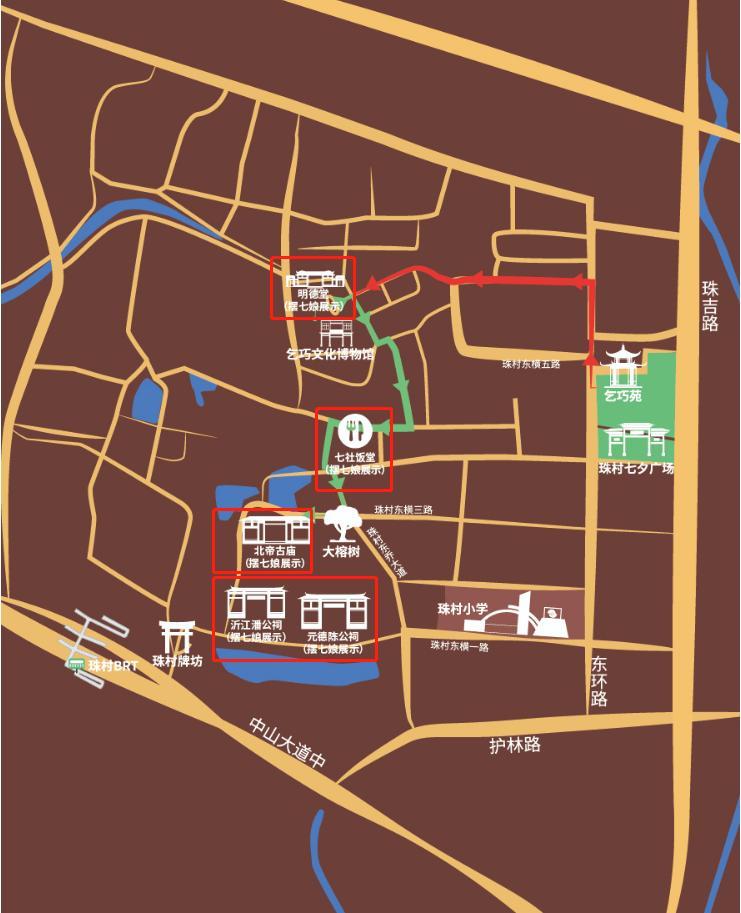 从明德堂出来,途经乞巧文化博物馆,继续沿着指示牌方向走,就来到了第二个七娘点七社饭堂。七社饭堂是珠村钟姓乞巧艺人的聚集地,也是“摆七娘”的重要景点之一。