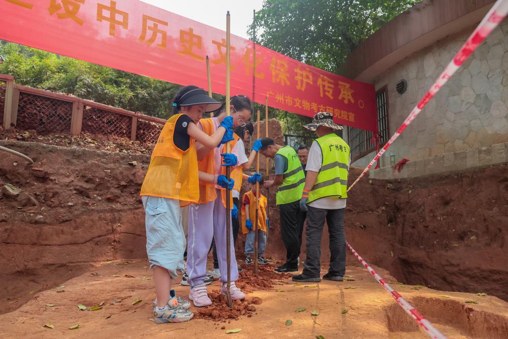 体验使用洛阳铲、通过刮面寻找遗迹、近距离观摩出土文物……4月13日,广州动物园大熊猫新馆的考古工地热闹无比,近20名中小学生化身小小体验官,走进千年古墓群实地探秘。