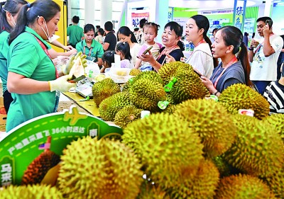 今年是马来西亚第三次担任东博会主题国,马来西亚“魅力之城”柔佛州展区摆放着当地饼干、猫山王榴莲等特色产品,香味四溢,令人垂涎。馆内工作人员介绍,与冷冻榴莲不同,此次马来西亚展商带来的是鲜果榴莲,口感更加浓郁细腻。因为运输方便,鲜果榴莲价格与冷冻榴莲相差无几。