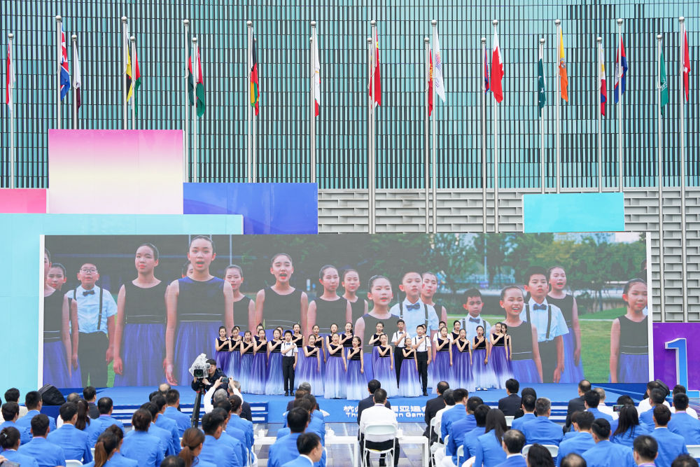 9月16日,杭州亚运会亚运村开村仪式暨中国体育代表团欢迎仪式在亚运村旗帜广场举行。图为小演员们在仪式上合唱杭州亚运会主题歌曲《同爱同在》。新华社记者杜宇摄!