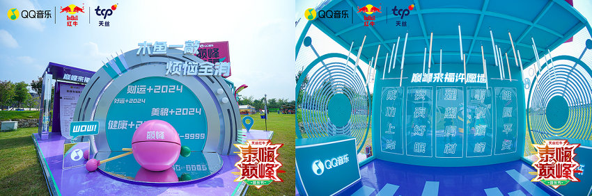 泰嗨巅峰音乐节特别设立QQ音乐“巅峰来福House”,在自我肯定夸夸镜前照出多种好心情,巅峰来福抽卡机送上祝福:搞钱要紧、皆如所愿、停止内耗抽取歌词祝福条,让每一位观众的泰嗨之旅都有好运相伴。同时大家也能扫码了解巅峰来福歌单,听歌收获福气。