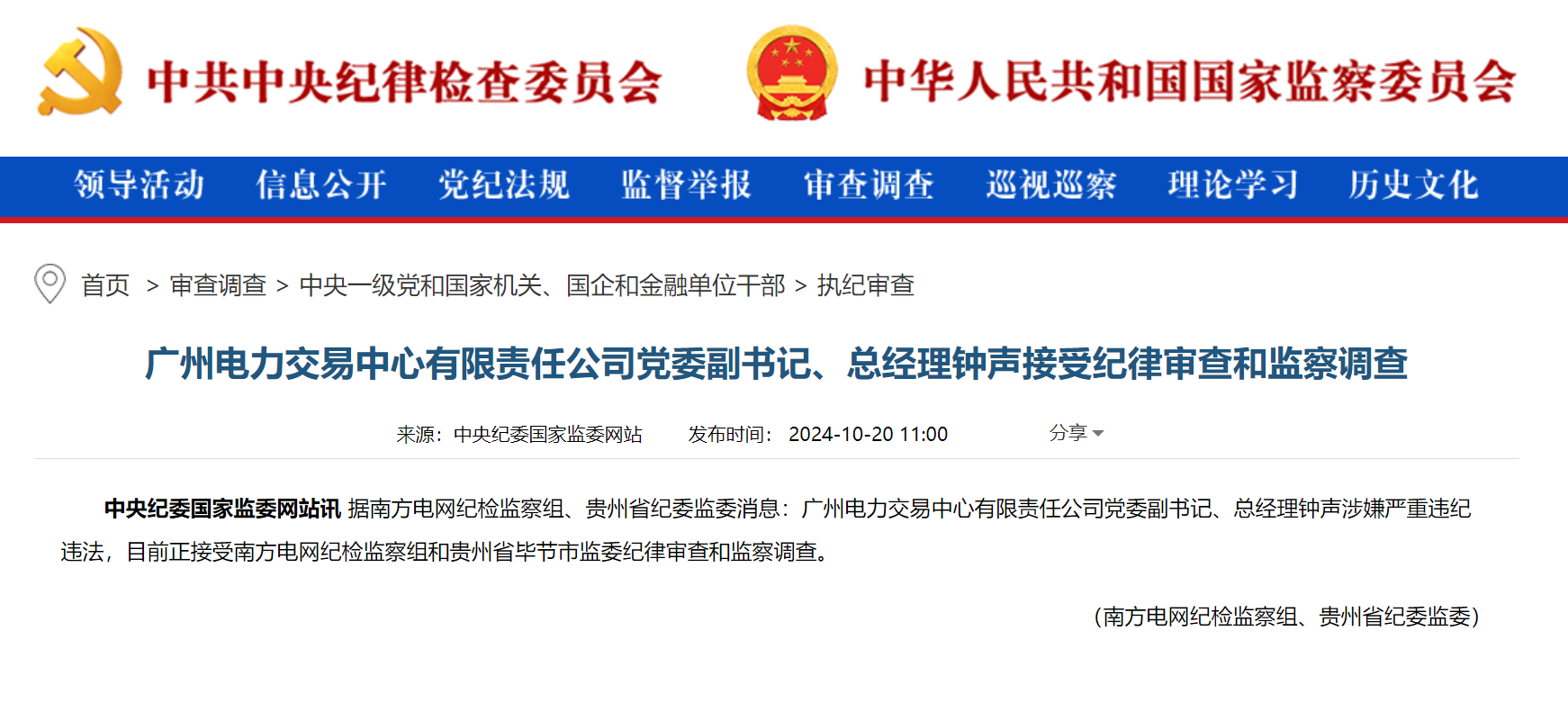 10月20日,据南方电网纪检监察组、贵州省纪委监委消息:广州电力交易中心有限责任公司党委、总经理钟声涉嫌严重违纪违法,目前正接受南方电网纪检监察组和贵州省毕节市监委纪律审查和监察调查。