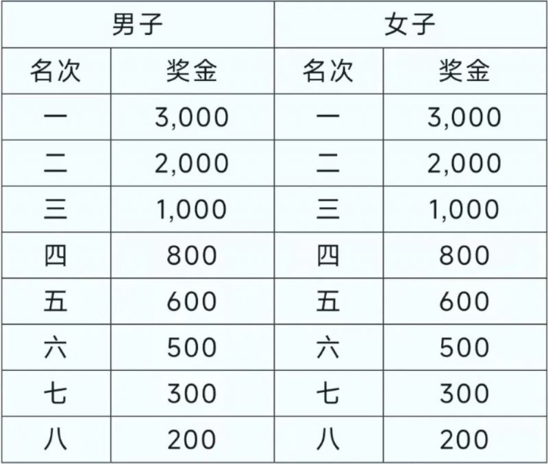 男、女第一至第八名(按枪成绩)选手分别获得如下表奖金(见正文),欢乐跑项目不设名次奖,完赛选手可自行在官方APP第一赛道下载打印纪念证书广州抓龙筋会馆。