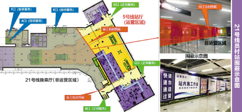 为什么说天河公园至员村区段是“归还”十一号线而不是由二十一号线“让出”?许坤杰解释,二十一号线起于天河公园站,止于增城广场站,在天河公园站与十一号线、十三号线二期进行换乘,以此实现这条东部线路与市区线路相连接。但由于十一号线、十三号线二期工程协调复杂、建设难度大、工期较长,二十一号线无法在短期内与既有市区地铁线年先行开工建设二十一号线时,就决定将属于十一号线的天河公园至员村区段纳入与其同步建设,并确定员村站建成后先“借用”作为二十一号线与五号线的换乘站,待十一号线开通运营时再“归还”。2019年12月二十一号线全线建成开通,员村站承担起“临时”换乘五号线年实现与市区地铁线天 其间两站部分区域围蔽。