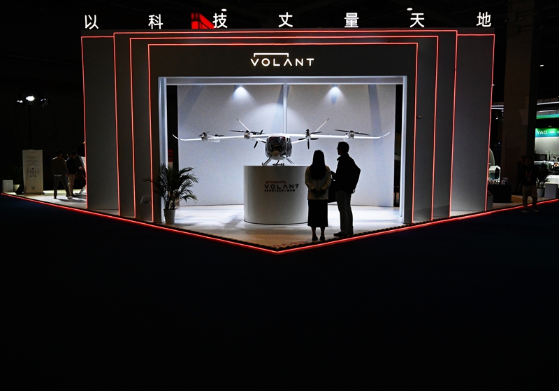 11月5日,观众在第七届进博会汽车展区参观一台电动垂直起降飞行器模型。新华社记者 张可任 摄。
