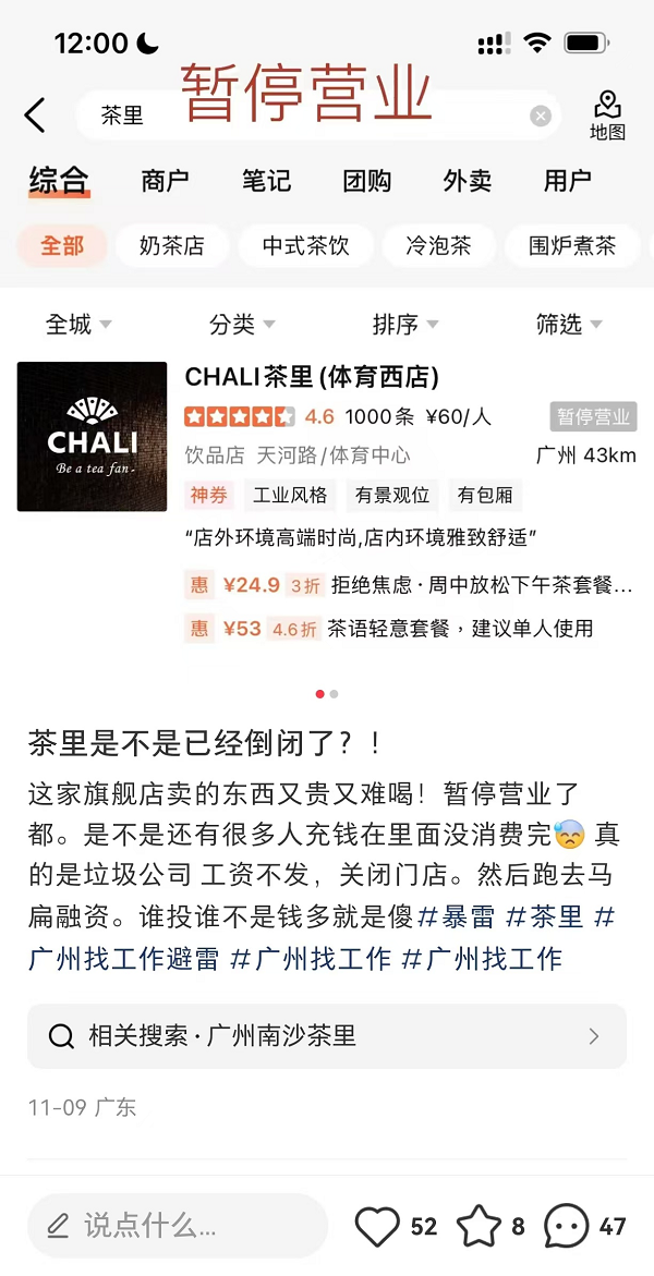 尽管声明否认大面积欠薪,茶里资金链紧张是不争的事实,茶里在声明中也承认公司面临巨大压力和挑战。中国网财经记者留意到,茶里在广州的部分线下门店暂停营业,茶里体育西路店已经暂停营业,有茶里的供应商则称茶里拖欠了供应商的欠款。